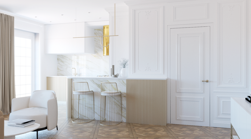 Projekt klasycznego apartamentu dla pary. Naszym głównym celem było stworzenie przestrzeni w stonowanej kolorystyce, sprzyjającej wyciszeniu i odpoczynkowi. Aby zachować klimat kamienicy, w której znajduje się apartament, zachowaliśmy istniejące sztukaterie, które po odnowieniu zyskały swój dawny blask.