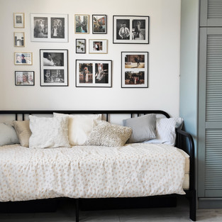 Ścianę nad łóżkiem wykorzystaliśmy do zrobienia galerii ze zdjęciami.